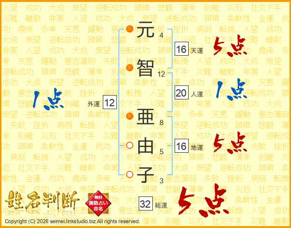 元智亜由子さんの総運は32画の5点!