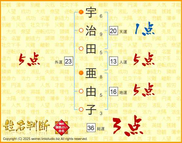 宇(6画)治(9画)田(5画) 亜(8画)由(5画)子(3画)