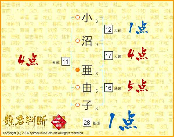 小沼亜由子さんの総運は28画の1点!