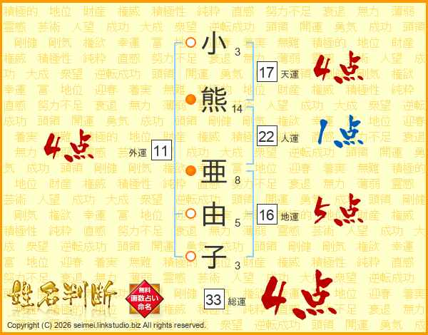 小熊亜由子さんの総運は33画の4点!