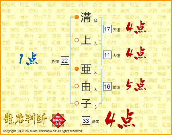 溝(14画)上(3画) 亜(8画)由(5画)子(3画)