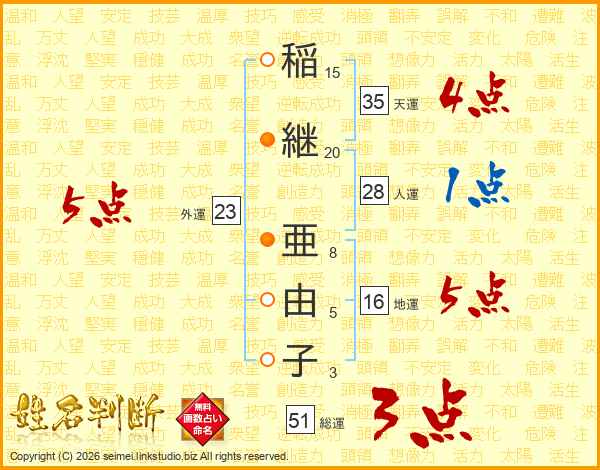 稲(15画)継(20画) 亜(8画)由(5画)子(3画)