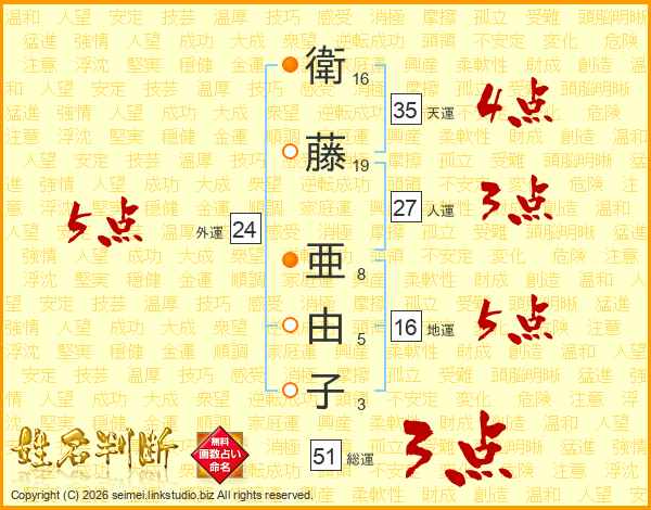 衛(16画)藤(19画) 亜(8画)由(5画)子(3画)