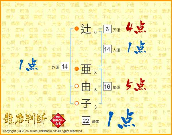 生活面を象徴する運勢です。外部から受ける影響力を表し、結婚運、家庭運や職場、環境への順応性を表します。総運から人運を引いた画数。姓や名が1文字の場合を除く。