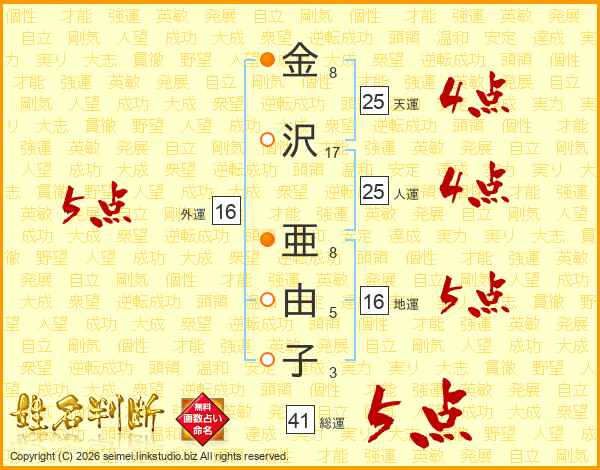 金(8画)沢(17画) 亜(8画)由(5画)子(3画)