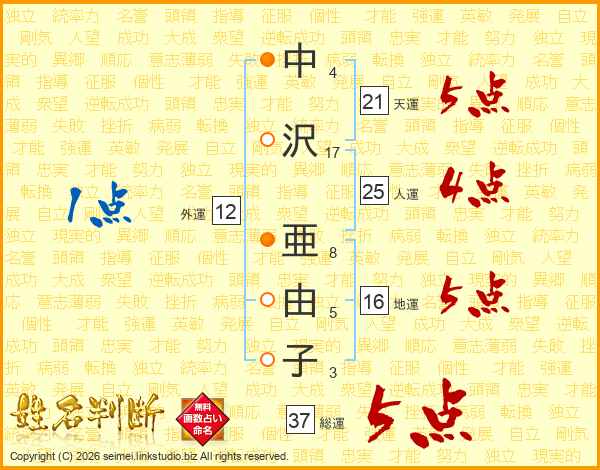 中沢亜由子さんの総運は37画の5点!