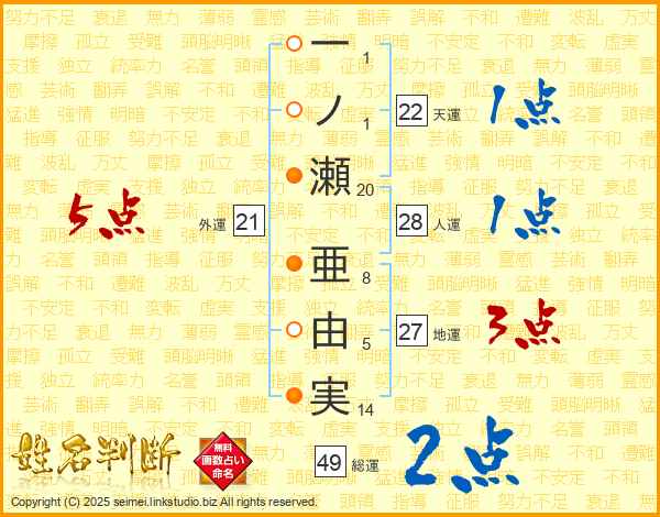 一(1画)ノ(1画)瀬(20画) 亜(8画)由(5画)実(14画)