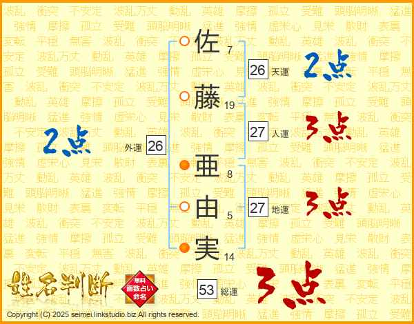 佐(7画)藤(19画) 亜(8画)由(5画)実(14画)