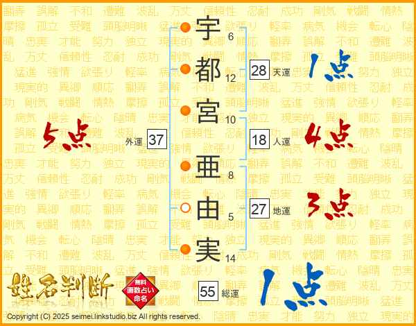 宇(6画)都(12画)宮(10画) 亜(8画)由(5画)実(14画)