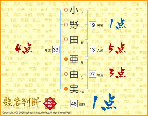 小(3画)野(11画)田(5画) 亜(8画)由(5画)実(14画)