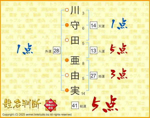 川(3画)守(6画)田(5画) 亜(8画)由(5画)実(14画)