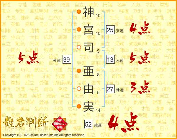 神(10画)宮(10画)司(5画) 亜(8画)由(5画)実(14画)