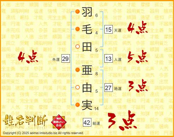 羽(6画)毛(4画)田(5画) 亜(8画)由(5画)実(14画)
