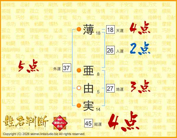 薄(18画) 亜(8画)由(5画)実(14画)