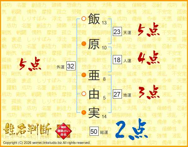 飯(13画)原(10画) 亜(8画)由(5画)実(14画)