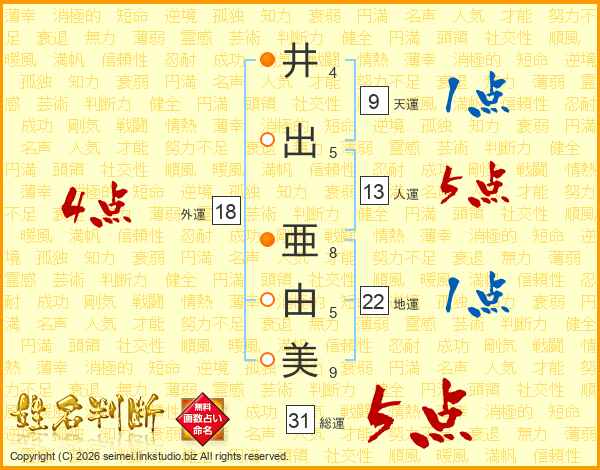 井(4画)出(5画) 亜(8画)由(5画)美(9画)