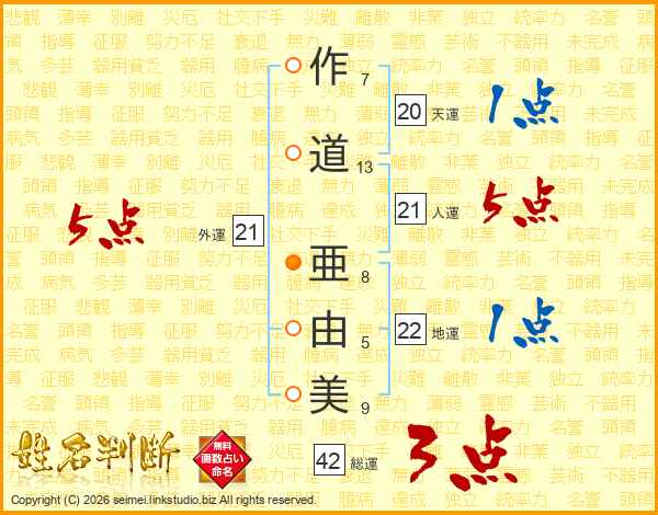作(7画)道(13画) 亜(8画)由(5画)美(9画)