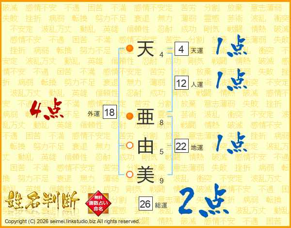 生活面を象徴する運勢です。外部から受ける影響力を表し、結婚運、家庭運や職場、環境への順応性を表します。総運から人運を引いた画数。姓や名が1文字の場合を除く。