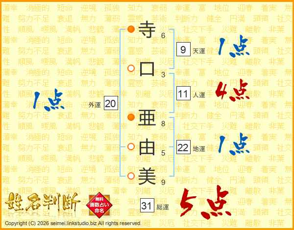 寺(6画)口(3画) 亜(8画)由(5画)美(9画)