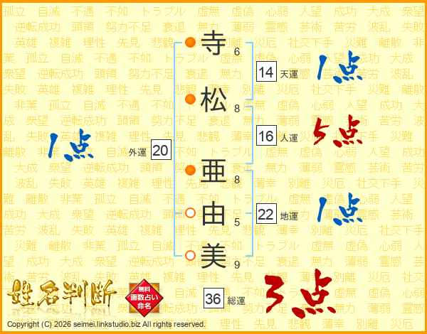 寺(6画)松(8画) 亜(8画)由(5画)美(9画)