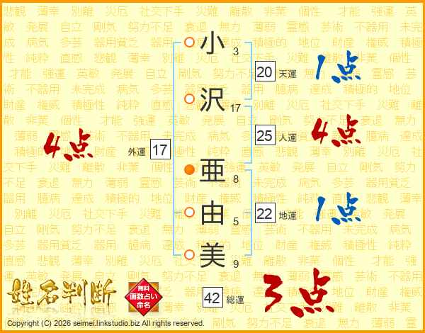 小(3画)沢(17画) 亜(8画)由(5画)美(9画)