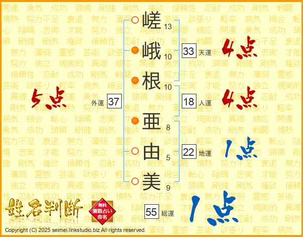嵯(13画)峨(10画)根(10画) 亜(8画)由(5画)美(9画)