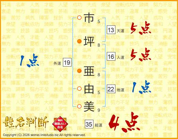 市(5画)坪(8画) 亜(8画)由(5画)美(9画)