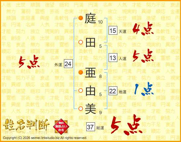 庭(10画)田(5画) 亜(8画)由(5画)美(9画)