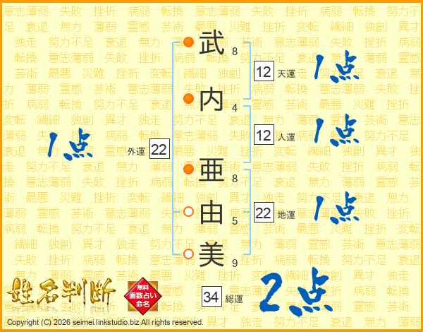 武(8画)内(4画) 亜(8画)由(5画)美(9画)