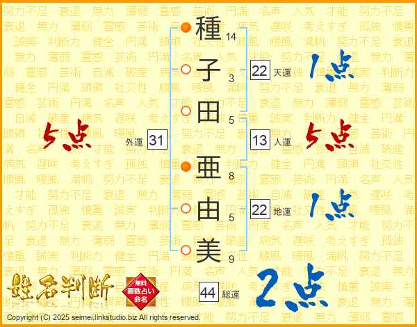種(14画)子(3画)田(5画) 亜(8画)由(5画)美(9画)