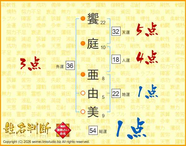 饗(22画)庭(10画) 亜(8画)由(5画)美(9画)