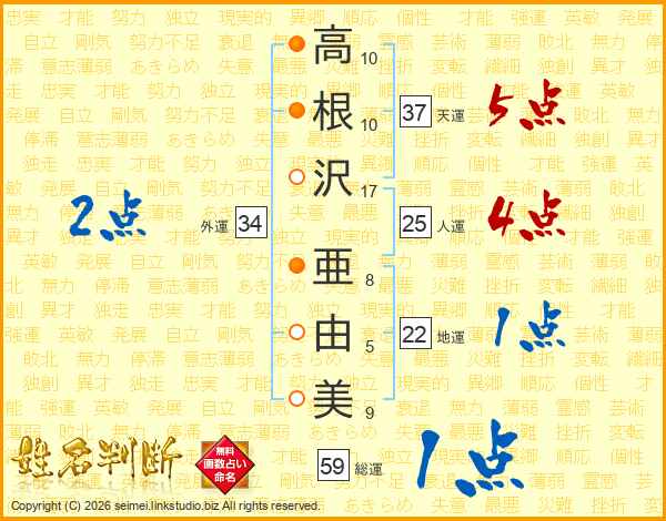 高(10画)根(10画)沢(17画) 亜(8画)由(5画)美(9画)