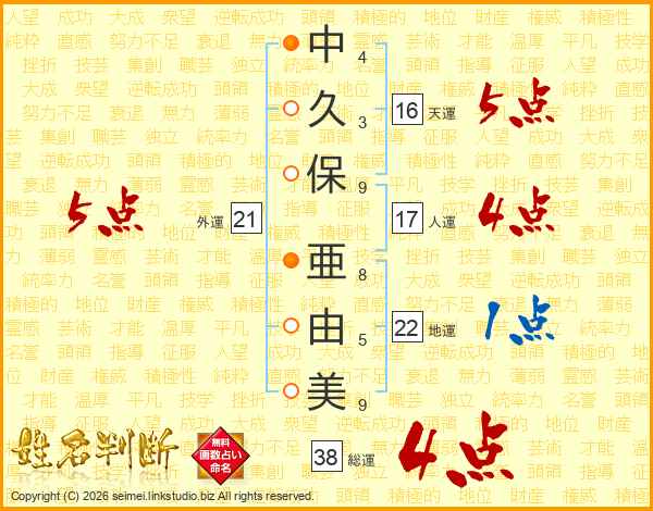 中(4画)久(3画)保(9画) 亜(8画)由(5画)美(9画)