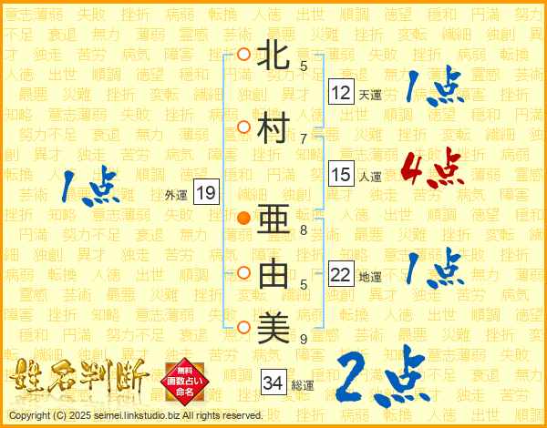 北(5画)村(7画) 亜(8画)由(5画)美(9画)
