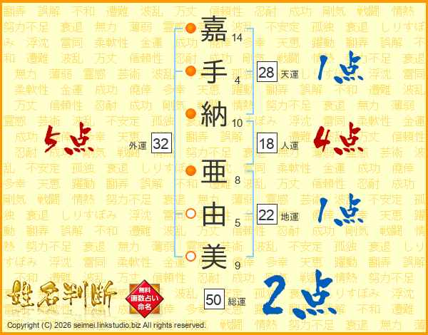 嘉(14画)手(4画)納(10画) 亜(8画)由(5画)美(9画)