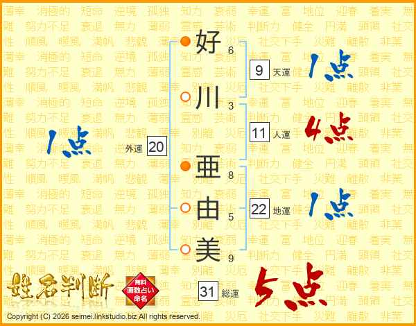 好(6画)川(3画) 亜(8画)由(5画)美(9画)