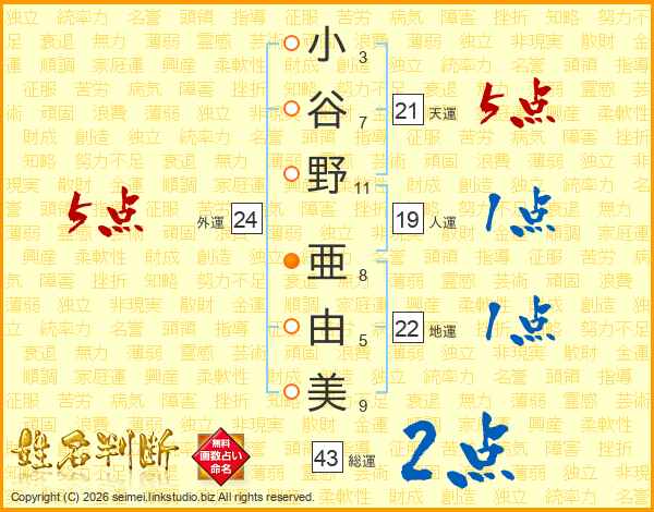 小(3画)谷(7画)野(11画) 亜(8画)由(5画)美(9画)