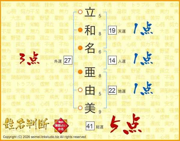 立(5画)和(8画)名(6画) 亜(8画)由(5画)美(9画)
