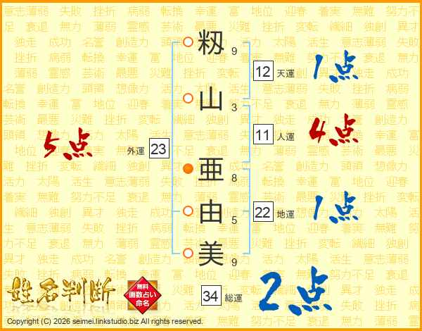 籾(9画)山(3画) 亜(8画)由(5画)美(9画)