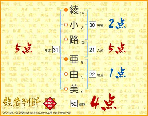 綾(14画)小(3画)路(13画) 亜(8画)由(5画)美(9画)