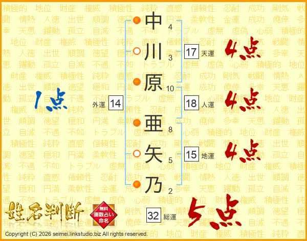 生活面を象徴する運勢です。外部から受ける影響力を表し、結婚運、家庭運や職場、環境への順応性を表します。総運から人運を引いた画数。姓や名が1文字の場合を除く。