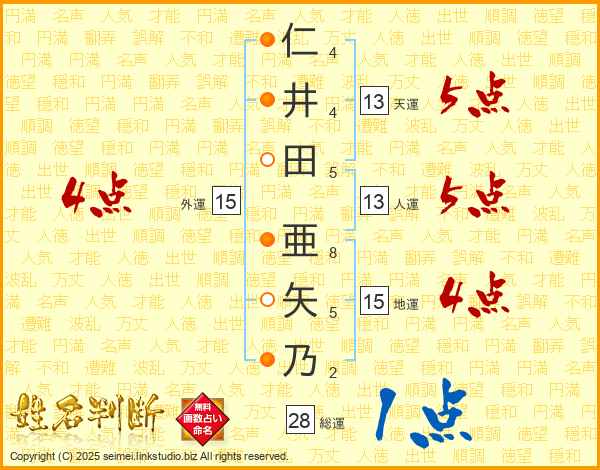 仁(4画)井(4画)田(5画) 亜(8画)矢(5画)乃(2画)