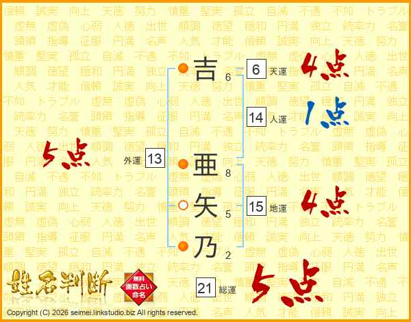吉(6画) 亜(8画)矢(5画)乃(2画)