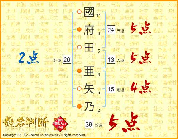 國(11画)府(8画)田(5画) 亜(8画)矢(5画)乃(2画)