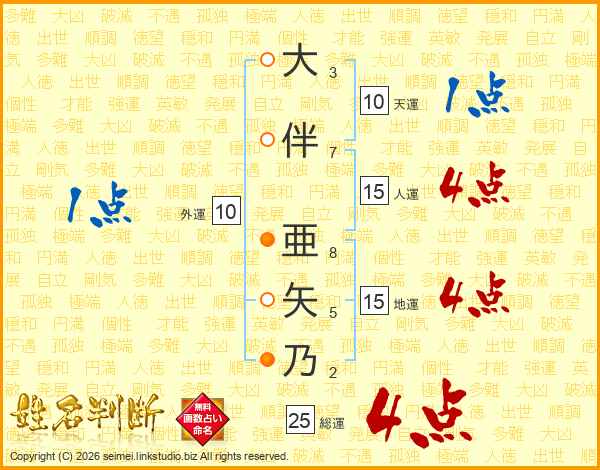 大(3画)伴(7画) 亜(8画)矢(5画)乃(2画)
