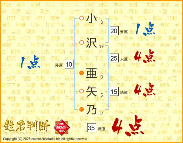 小(3画)沢(17画) 亜(8画)矢(5画)乃(2画)