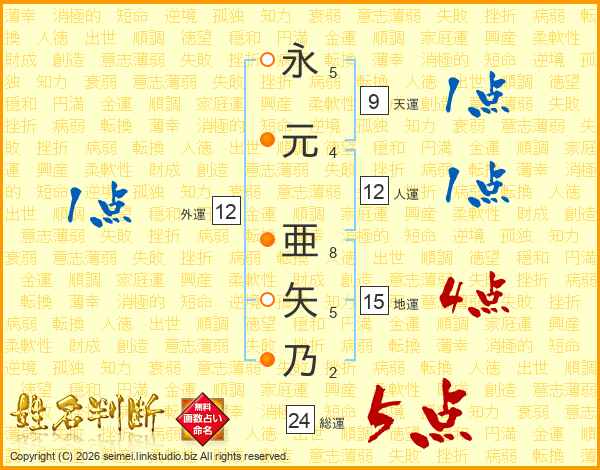 永(5画)元(4画) 亜(8画)矢(5画)乃(2画)