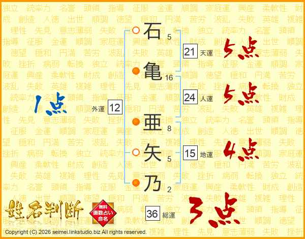 石亀亜矢乃さんの天運は21画の5点!