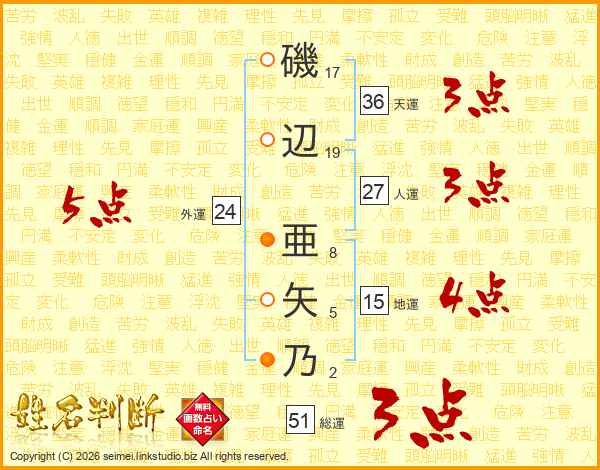 磯辺亜矢乃さんの総運は51画の3点!