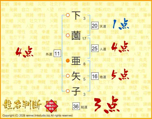 下(3画)薗(17画) 亜(8画)矢(5画)子(3画)